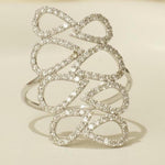 This stunning statement ring showcases a cascading pattern of pear-shaped loops, each outlined with natural diamonds for a refined sparkle. The elongated, layered design creates a graceful silhouette, accentuating the finger with an elegant, flowing form. Perfect for lovers of unique jewelry, this piece adds sophisticated allure to any look, whether for a special occasion or an elevated everyday style. Let it shine solo as a bold focal point, or pair it with simple accessories for a modern, polished finish.