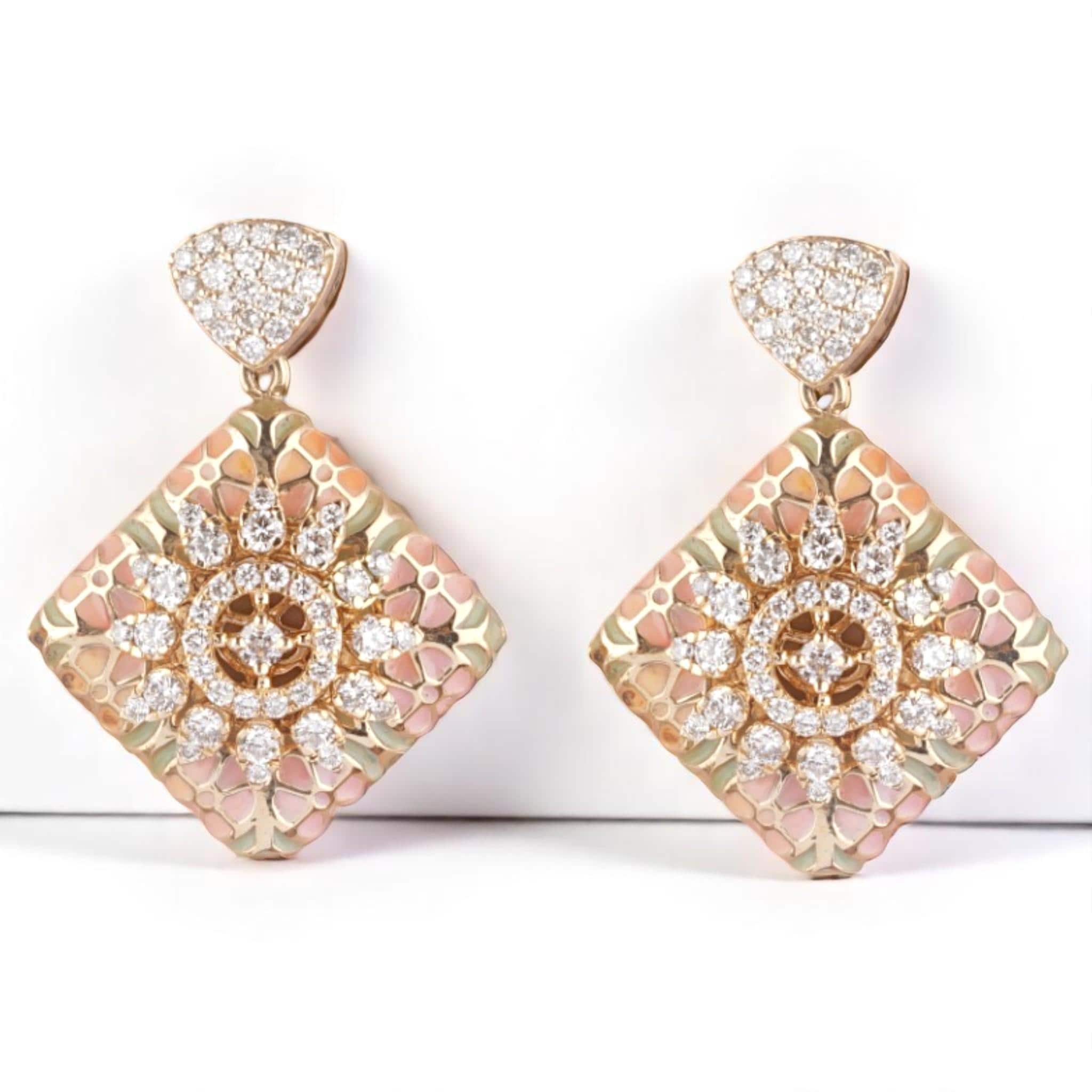 Floral Diamond Dangle Earrings, 14k Solid Gold, Natural Diamonds, Honeycomb Square Enamel Drops, Cocktail Statement Jewelry