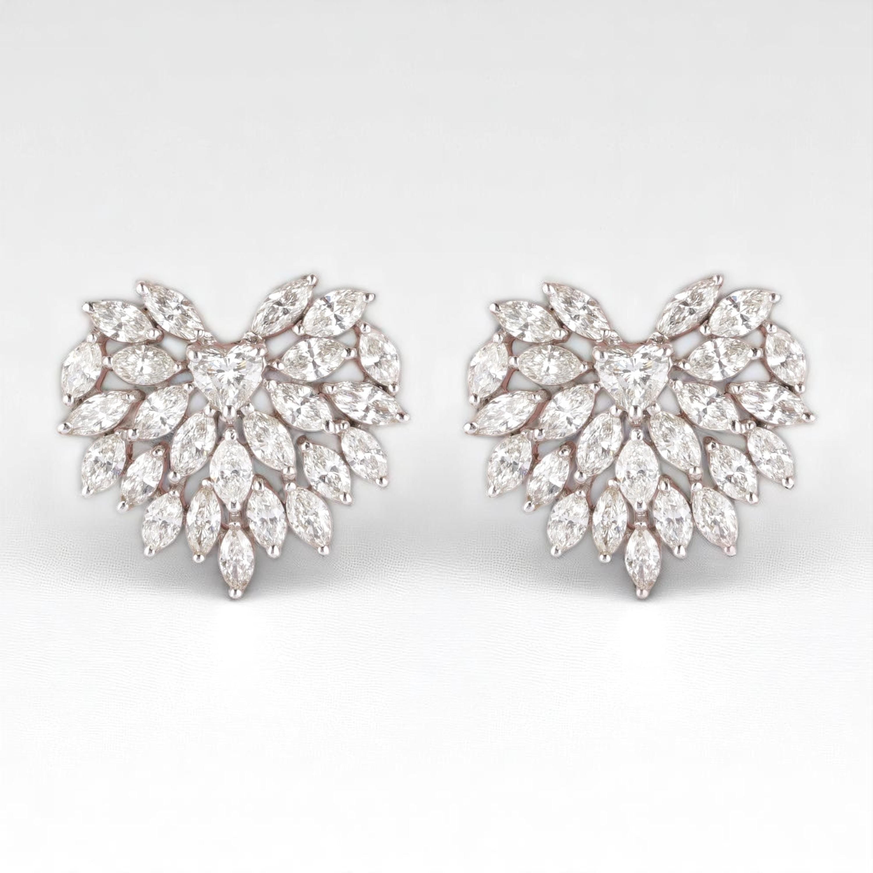 Heart Cluster Stud Earrings, 14k Solid Gold, Natural Diamonds, Angel Marquise Wings Earrings, Bridal Statement Jewelry, Cocktail Studs