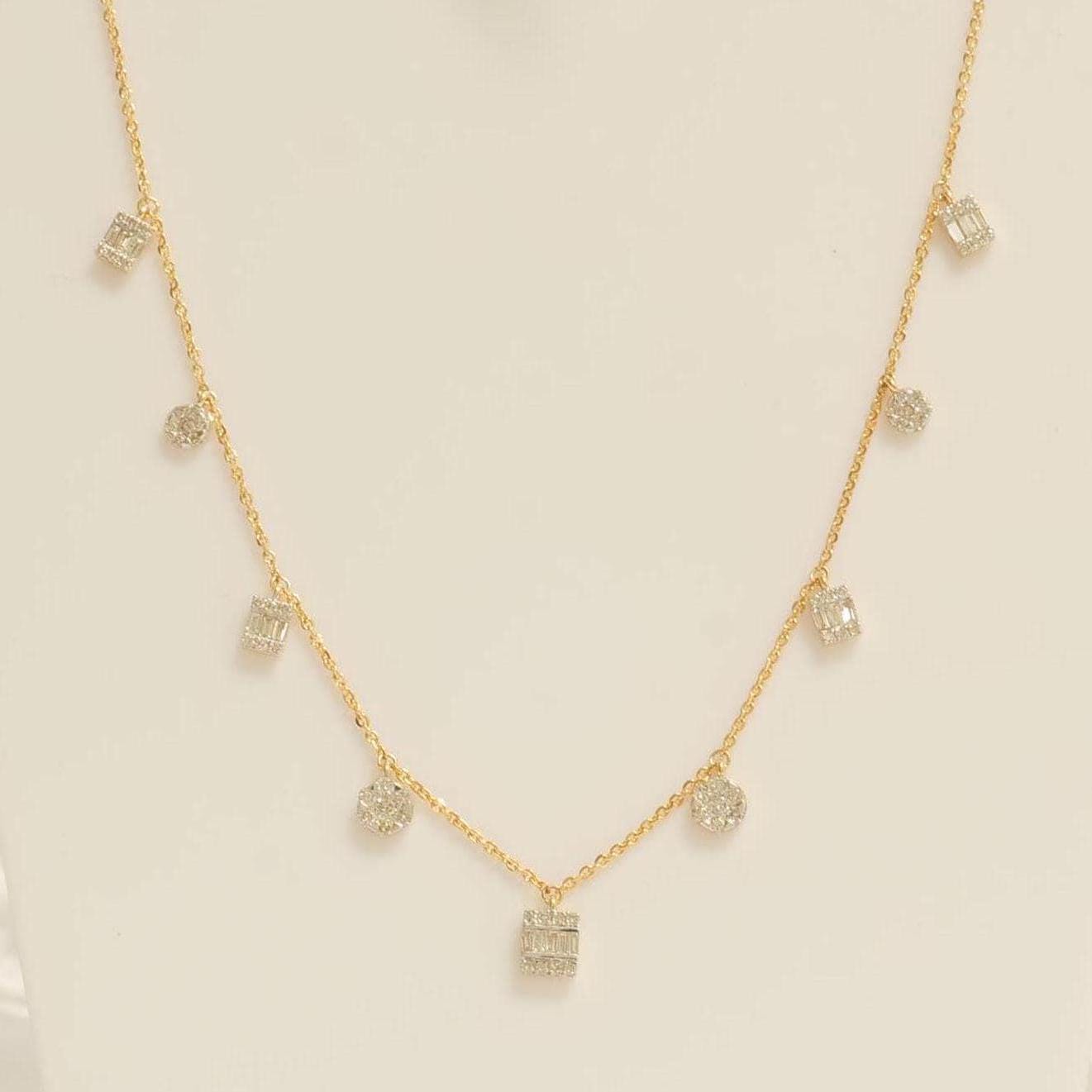 Dangling Diamond Station Necklace, 14k Solid Gold, Natural Diamond, Illusion Set Necklace, Baguette Round Jewelry, Minimalist Layering Chain