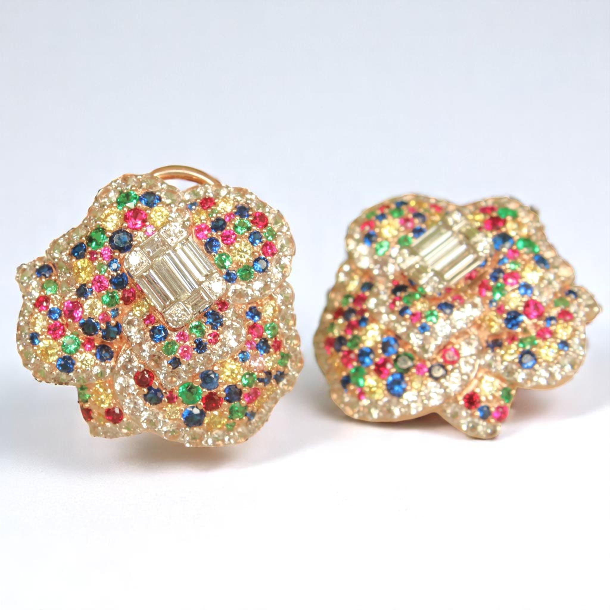 Flower Rainbow Stud Earrings, 14k Solid Gold, Natural Diamonds, Multicolor Cocktail Jewelry, Bridal Wedding Earrings, Statement Party Studs