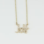 This delightful gold necklace features the word "Joy" in a playful and elegant script, adorned with sparkling diamonds. The pendant is suspended on a delicate gold chain, making it a versatile piece suitable for both everyday wear and special occasions. This necklace radiates positivity and happiness, making it a perfect gift or a personal keepsake to brighten up your jewelry collection.