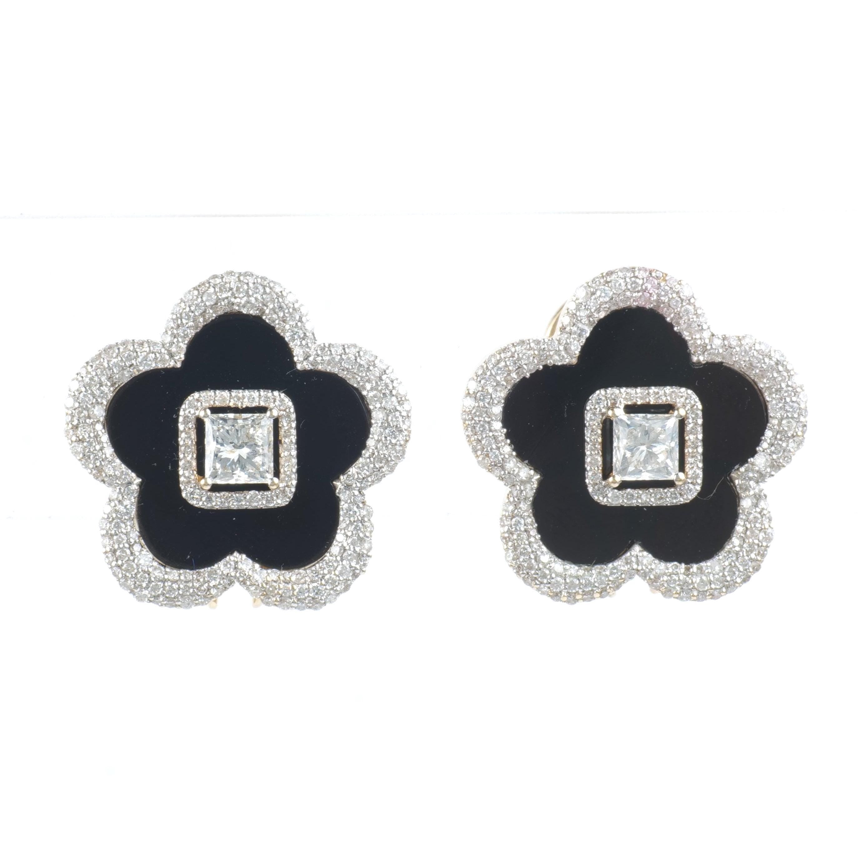 Onyx Flower Diamond Stud Earrings, 14k Solid Gold, Fancy Natural Diamonds, Floral Halo Studs, Gemstone Statement Earrings, Certified Jewelry