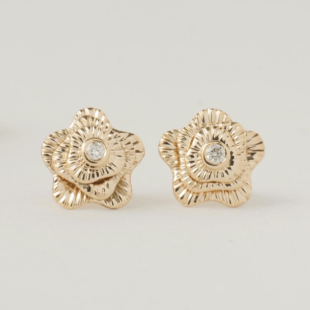 Kids Textured Floral Diamond Earrings, 14k Solid Gold, Natural Diamond, Layered Petal Bloom Studs, Gift for toddler/girls/kid, Ready To Ship