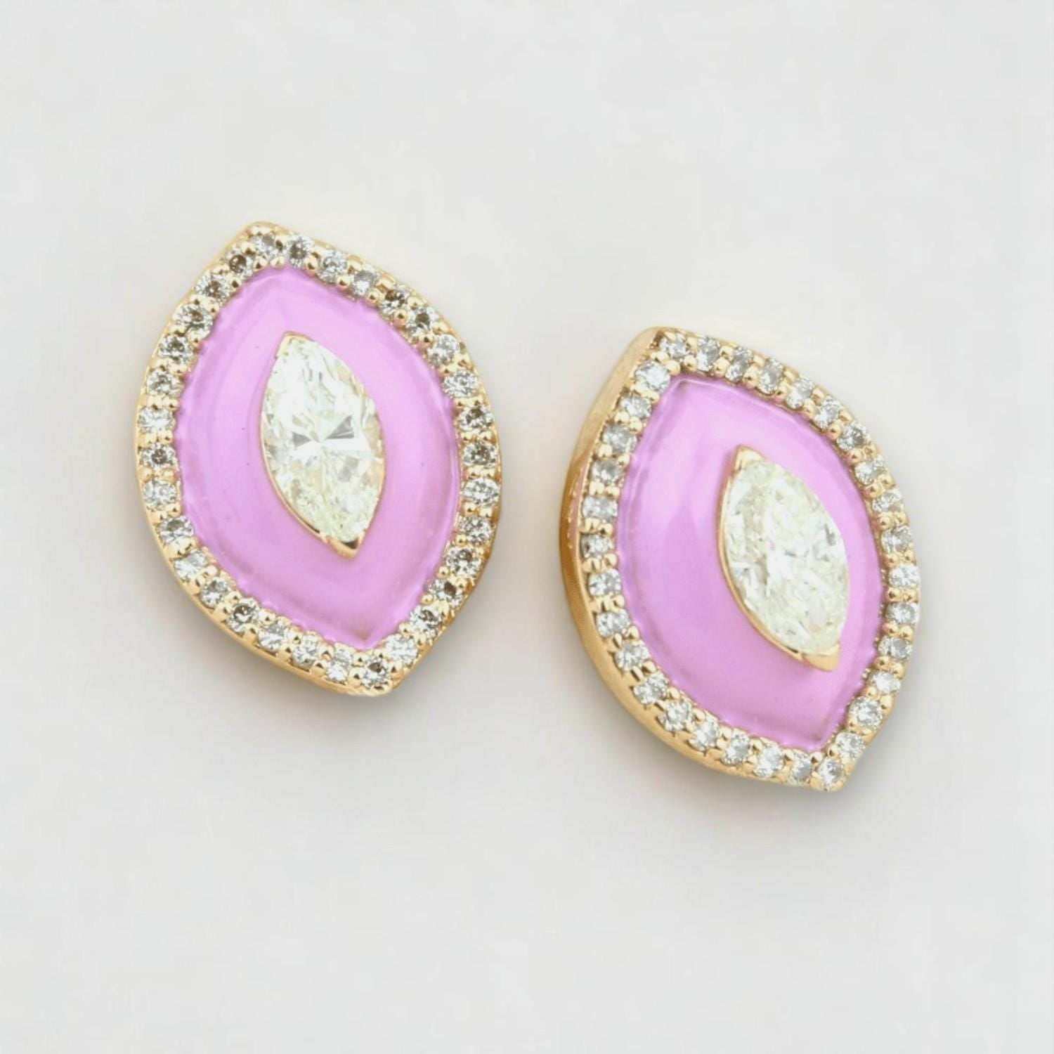Eye shape Diamond Stud Earrings with Pink Enameling in 14k Solid Gold, Marquise & Round Natural Diamonds, Ready To Ship, Women's Day Gift