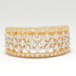 Crafted in 14k solid gold, this wide band ring features a lattice-style diamond layout with multiple rows of round natural diamonds held in open prongs. The pattern allows light to pass through, creating a lace-like effect across the finger. The polished gold edge adds structure and contrast. Ideal for weddings, festive looks, or stacking with finer rings for an elevated stack.