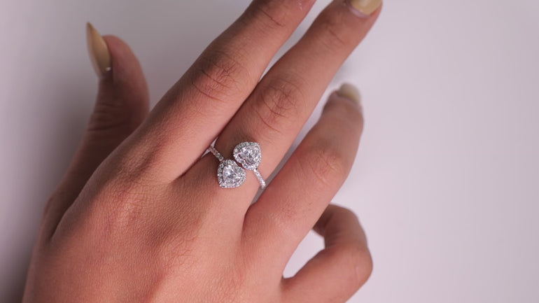 This bypass ring features two heart-shaped natural diamonds, each surrounded by a fine halo of pavé-set diamonds. The twin hearts sit on an open band crafted in 14k solid gold and adorned with additional diamonds along the shoulders. The bypass style wraps gently around the finger, forming a symbolic connection between the two stones. A meaningful piece that’s equally suitable for gifting, personal milestones, or everyday wear.