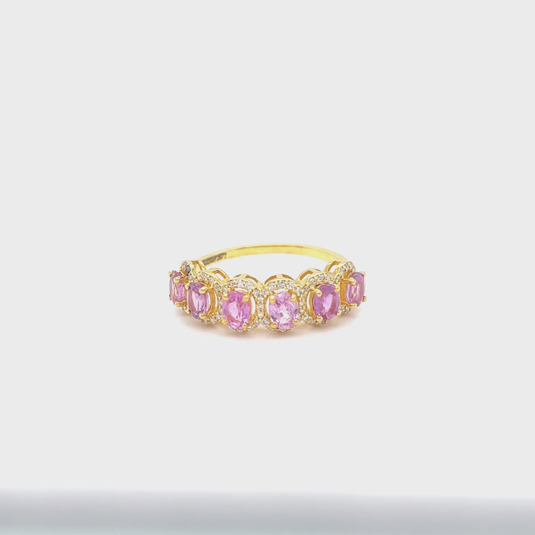 This half eternity ring features oval-cut pink sapphires aligned in a clean row, each framed with a delicate halo of natural diamonds. Set in 14k solid yellow gold, the gemstones cover the top half of the band, offering both sparkle and comfort. The combination of pink and yellow tones creates a warm contrast, making it suitable for layering or wearing solo.